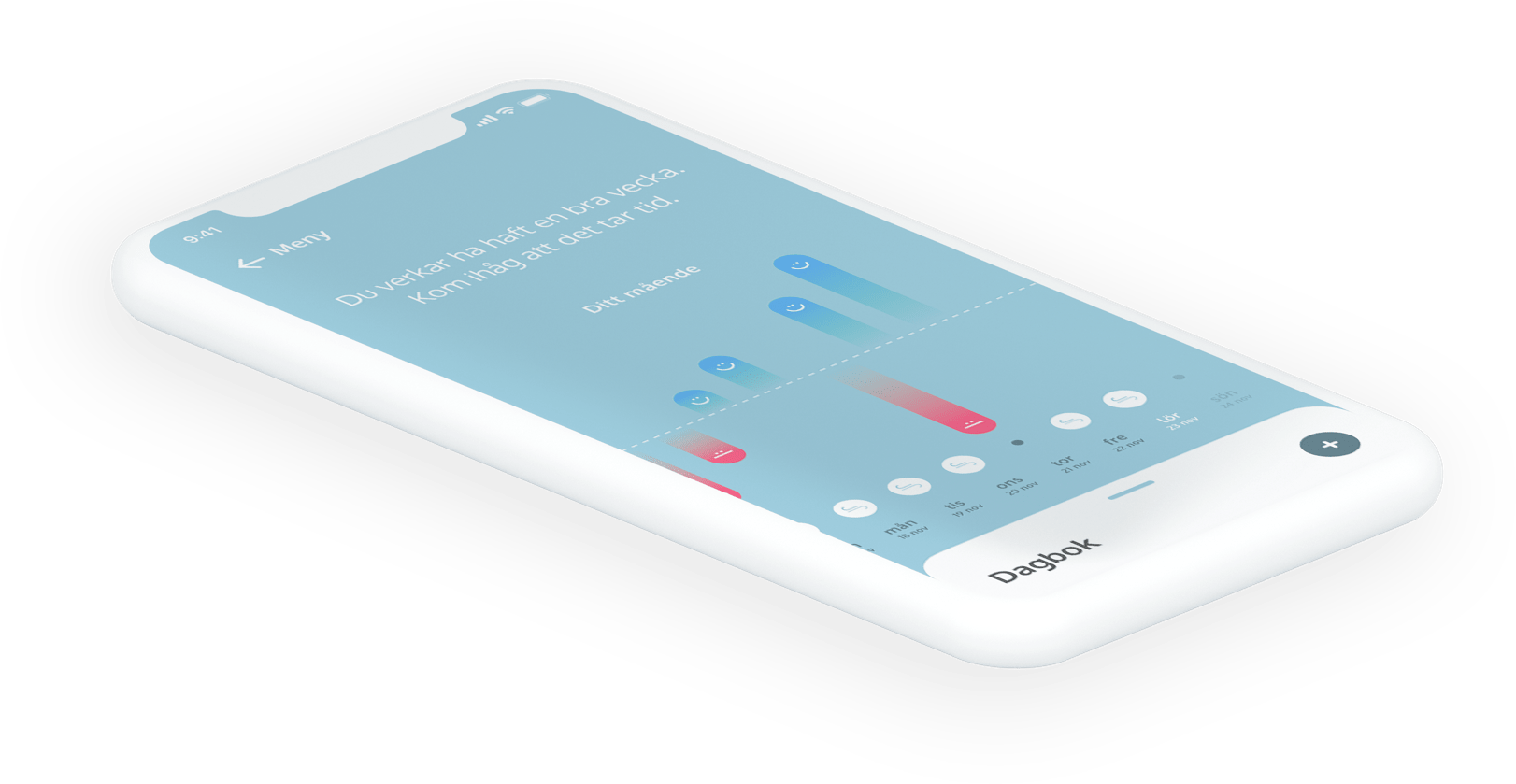 In order to meet the large group affected by stress-related mental illness, development of new innovative methods is needed. The app's interface is designed with calm colors in mind and a color spectra that illustrate the balance between feelings while moving in a harmonious movement when you start the app.